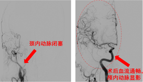病例3(技术攻坚典范)——“生命通道”的极限修复:一位55岁男性,因突发左侧偏瘫、意识不清由120紧急送医。神经内科立即予以静脉溶栓,同时脑卒中一站式检查发现其右侧颈内动脉颅外段已完全闭塞,大脑面临严重缺血。神经外科介入团队在手术中遭遇了巨大挑战:患者病因并非普通血栓,而是颈动脉血管壁撕裂(夹层) 造成的闭塞,同时脱落的血栓还堵塞了大脑中动脉M2段;更棘手的是,通往病变的血管路径存在360°极度迂曲,器械通过异常困难。面对这一复杂险情,团队凭借高超的技术与丰富的经验,迎难而上。不仅将远端血栓悉数取出,更成功在颈动脉夹层部位精准植入支架,封堵破口,使夹层完美愈合,血流通畅恢复。术后患者恢复显著,意识完全清醒,并可自主下地行走。此例手术的成功,是我院在卒中介入领域实现的一项重大技术突破。