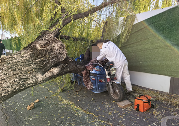 11月16日,我区发布大风黄色预警,狂风呼啸中,车站路附近一棵直径近30厘米的行道树被拦腰吹断。粗壮的树干携茂密枝叶轰然砸向路面,一名骑行经过的市民躲避不及,被牢牢压在树下,生命安全受到严重威胁。