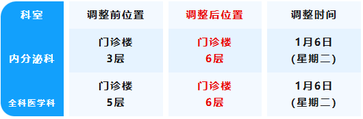 为进一步优化门诊就诊流程,改善门诊就医环境,自2026年1月6日(周二)上午7:45起,内分泌科、全科医学科门诊区域调整,具体如下: