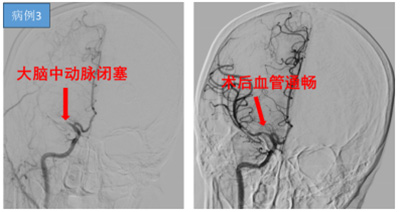 病例1——高龄患者的希望之光:(80岁男性)突发左侧肢体瘫痪并迅速陷入意识模糊。急诊排除脑出血后,神经内科立即给予静脉溶栓。鉴于患者意识改善不明显,脑卒中一站式检查火速完成,揭示病因为 “右侧大脑中动脉闭塞” ,且其供血区存在大面积濒危脑组织。神经外科介入团队即刻接力,行急诊取栓术,成功实现血管再通。术后患者意识逐渐转清,目前正在康复科进行系统功能锻炼。