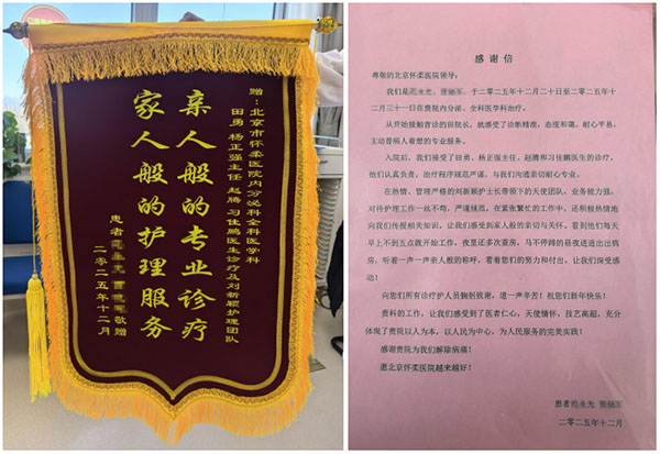 近日,已经痊愈出院的范先生和贾先生给北京怀柔医院全科医学科、内分泌科送来了一份特殊的“新年礼物”,一封饱含深情的感谢信和一面锦旗。锦旗上“亲人般的专业诊疗、家人般的护理服务”以及感谢信里朴实真挚的语言,不仅是对科室医护团队专业能力与人文关怀的最高褒奖,更是医患同心、共护健康的生动写照。