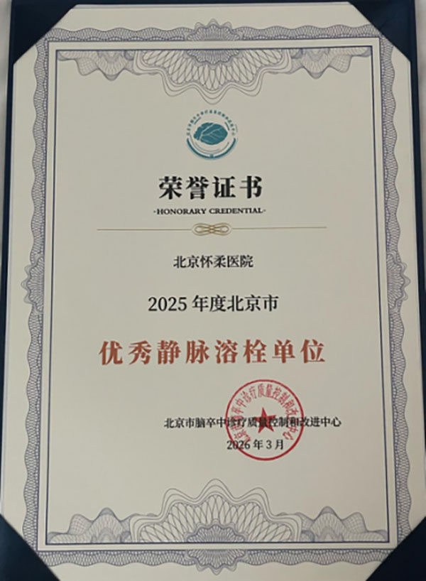 与此同时,经北京市脑卒中质量控制与改进中心严格评审,北京怀柔医院再次获评“优秀静脉溶栓单位”。该荣誉连续授予,彰显了医院在静脉溶栓技术、取栓技术、绿色通道建设及医疗质量改进上的扎实工作和卓越成效。