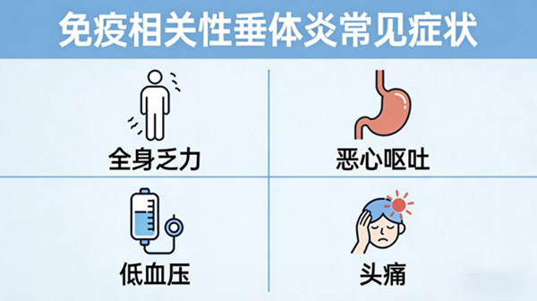 常见症状:多在免疫治疗数周~数月后出现,主要表现为全身乏力、恶心呕吐、食欲差、低血压、嗜睡、头痛等,症状无特异性,易与肿瘤进展、普通体虚混淆,严重时可危及生命。