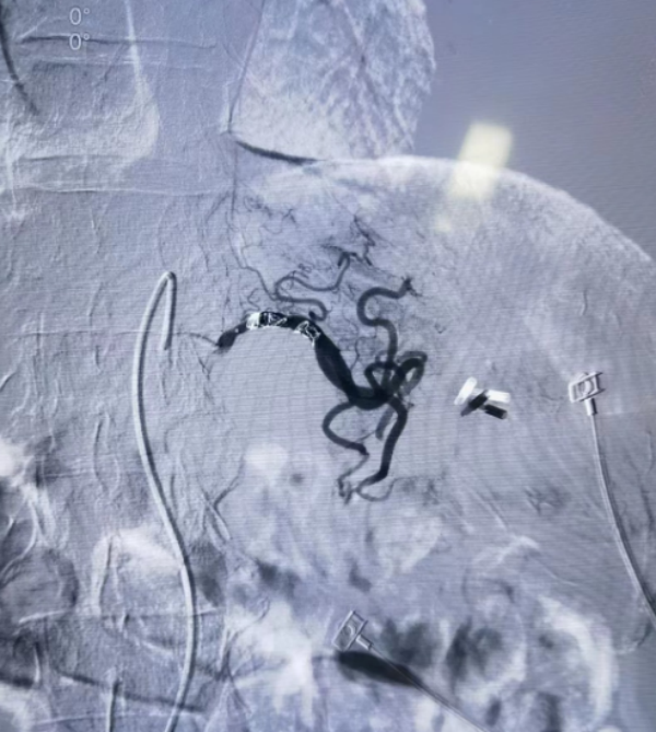 请血管外科宋海龙主任医师会诊后,决定立即行介入栓塞治疗。术中可见粗大的病变血管显影,给予弹簧圈及明胶海绵等栓塞剂后病变血管远端血流消失,止血效果立竿见影。