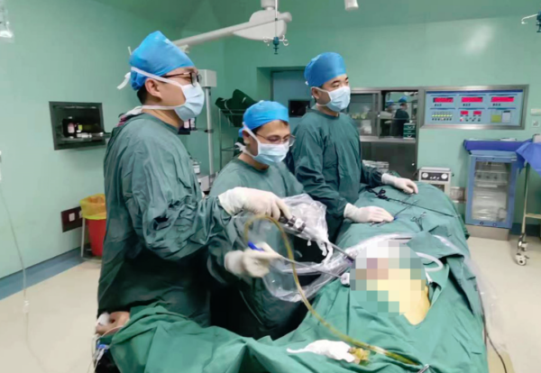 经过与患者亲属详尽交代病情并取得同意后,当天下午3点患者被紧急推入手术室。由于患者是聋哑人,与医护沟通极其困难,因此从患者的病史及体格检查方面难以确定患者具体的穿孔部位。如采取传统开腹手术探查,其切口较大、创伤也更大,且患者术后康复的时间也相对更长。普外科负责人谭社荣副主任医师当即决定为患者实施腹腔镜微创手术。